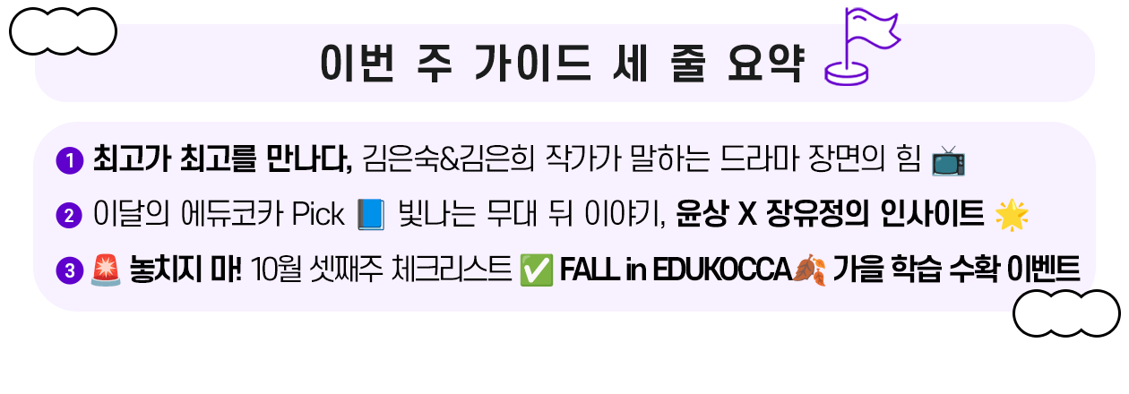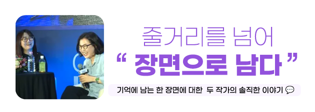 이처럼 장면 하나가 작품 전체를 대표하기도 합니다. <도깨비>, <태양의 후예>의 김은숙 작가와 <시그널>, <킹덤>의 김은희 작가 역시, 자신의 커리어와 인생을 바꾼 장면을 꼽으며 드라마가 완성되는 힘을 들려주었는데요! 오늘 콩! 에서는 두 작가의 이야기를 통해 위기를 뚫는 실행, 팀을 살리는 철학, 그리고 인생 장면이 생기는 순간을 함께 살펴보겠습니다. 💬💜 |