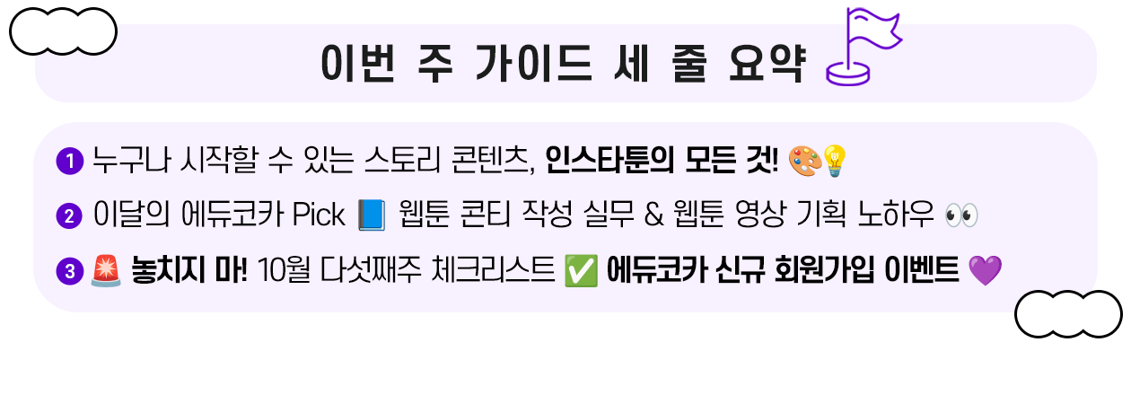 인스타툰 제작 노하우에 대해 알아 본 이번 주 콩! "오늘부터 시작! 소소한 일상을 콘텐츠로 바꾸는 인스타툰 가이드 💭" 어떠셨나요? 🙆♀️ |