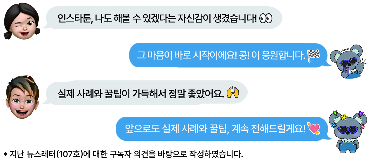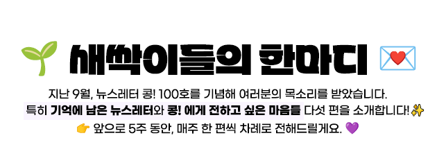 최근 좋아하는 가수가 앨범과 소설을 함께 선보였을 때, 콩! 에서 읽은 트랜스미디어가떠올라 음악을 두 배로 즐길 수 있었어요! 🥰 이렇게 생활 속에서 콩! 이 자주 떠올라 참 뿌듯해요! |