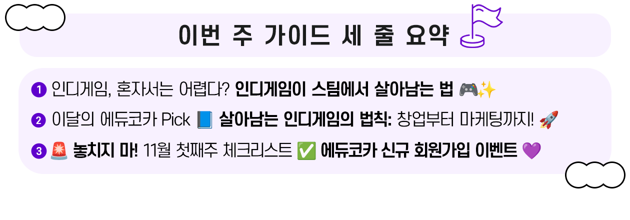 데이터와 전략으로 버티는 인디게임의 생존법에 대해 알아 본 이번 주 콩! "스팀에서 살아남는 인디게임의 비밀, 감각이 아닌 전략 💡" 어떠셨나요? 🙆♀️ |