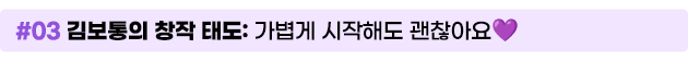 하지만 그 ‘가벼움’ 속엔 분명한 진심이 있었습니다. 실패를 두려워하지 않고, 일단 시작해보는 용기 말이에요. 가볍게 시작했지만 그 안엔 단단한 마음이 있었고, 결과를 예측하기보다 과정 안에서 배우려는 태도가 결국 지금의 김보통 작가를 만들었죠.