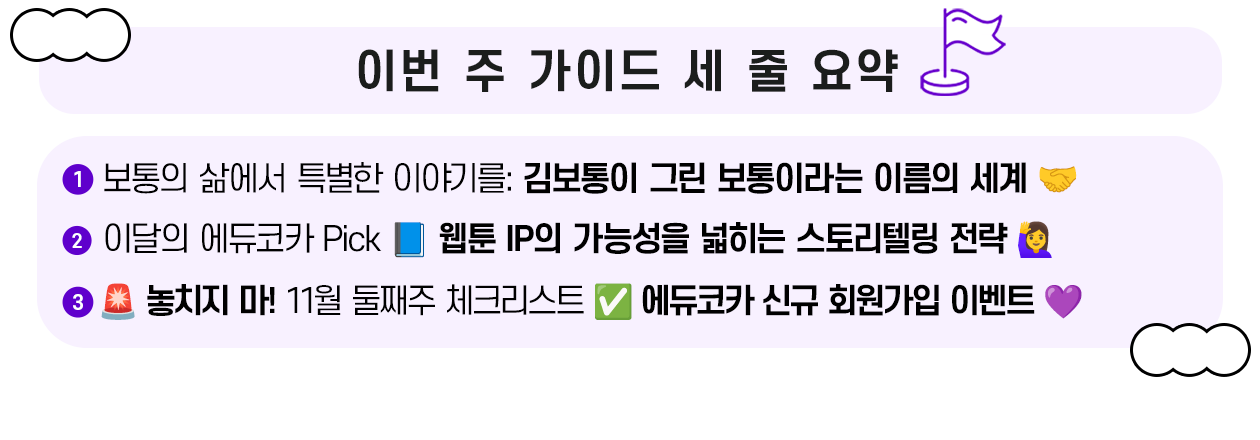 현실의 문제를 이야기로 바꾸는 스토리텔링 전략에 대해 알아 본 이번 주 콩! "보통의 삶에서 특별한 이야기를 그리다✨ (Feat. <D.P.> 김보통 작가)" 어떠셨나요? 🙆♀️ |