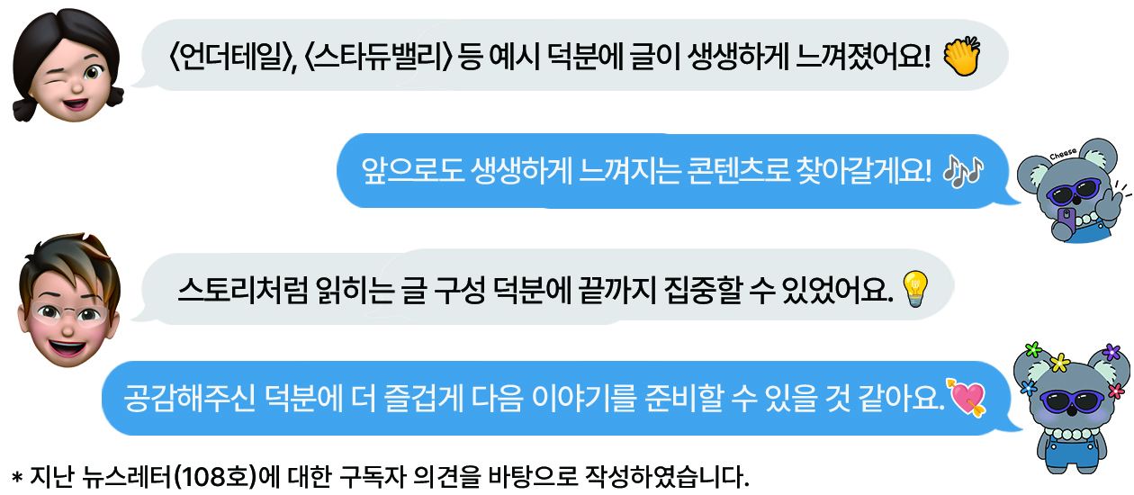 OTT 콘텐츠가 단순한 결과물이 아니라 수많은 사람들의 열정이 모여 만들어진다는 걸 알게 된 편이 기억에 남습니다. 콩! 은 매주 배움과 영감을 주는 소중한 친구 같아요. 다음 호가 기다려지는 이유가 바로 여기에..💜 |
