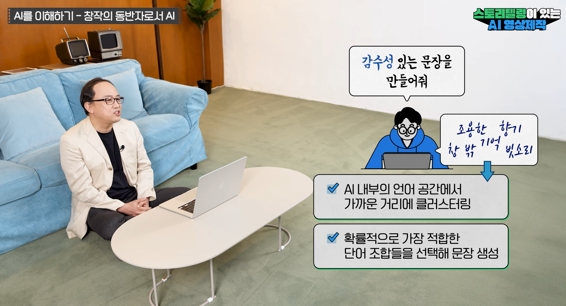 예를 들어 “감수성 있는 문장을 만들어줘”라고 요청하면, AI는 ‘감수성’이라는 단어와 함께 자주 등장했던 표현들을 떠올립니다. ‘조용한’, ‘그리움’, ‘기억’, ‘창밖’, ‘빗소리’ 같은 단어들이죠. 이 단어들은 AI 안의 언어 공간(latent space)에서 의미적으로 가까운 위치에 모여 있고, AI는 그중에서 가장 자연스러워 보이는 조합을 골라 문장을 만들어냅니다. 그래서 “빗소리가 고요히 창밖을 스치며, 오래된 기억 하나가 스며든다.” 같은 문장이 나오는 거예요. 이 문장은 어디서 그대로 가져온 문장이 아니라, ‘감수성’이라는 키워드와 가까운 표현들이 확률적으로 엮인 결과입니다.