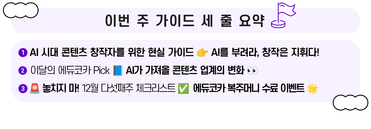 AI 시대 콘텐츠 창작자를 위한 현실 가이드에 대해 알아 본 이번 주 콩! <AI 잘 쓰는 사람은, 질문부터 다릅니다 ✍️> 어떠셨나요? 🙆♀️ |