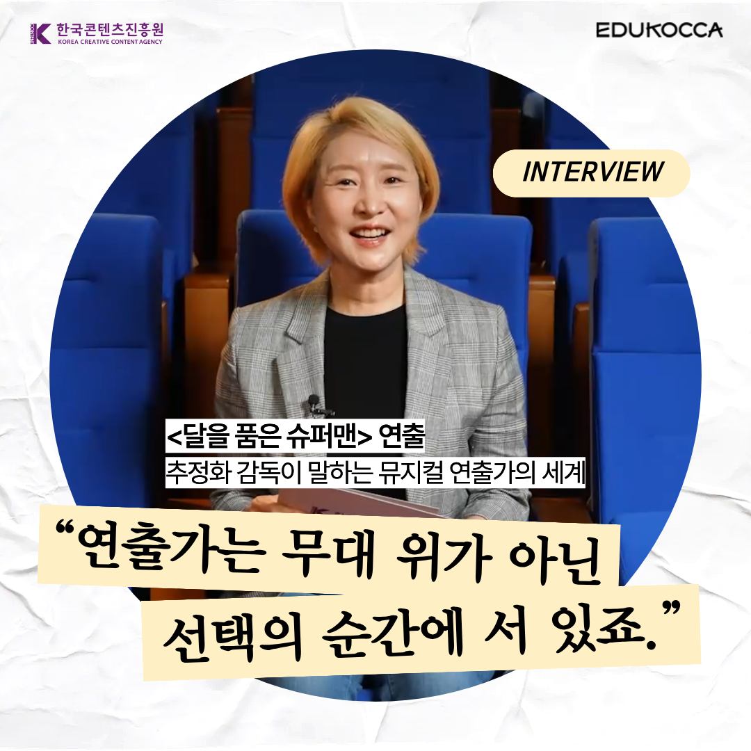오늘 콩! 에서는 뮤지컬 <프리다>, <달을 품은 슈퍼맨>을 연출한 뮤지컬 연출가 추정화 감독을 만났습니다. 연출가, 작품 이야기를 하다 보면 연출가 이름은 꼭 한 번쯤 등장하죠. 무대 위에 서는 사람은 아닌데, 작품 이야기를 할 때는 빠지지 않고요. 그래서 연출가는 늘 조금 알 듯 말 듯한 직업처럼 느껴집니다.