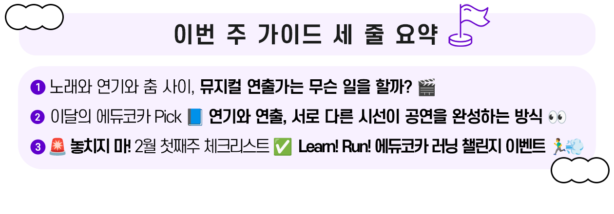정리해 보면, 뮤지컬 연출가의 일은 텍스트 → 음악 → 움직임 → 무대까지 이어지는 모든 선택이 같은 방향을 향하고 있는지 계속 확인하는 일에 가까워요. 그래서 연출가는 늘 작품의 한 장면뿐 아니라, 처음과 끝을 함께 떠올리며 작업하는 사람이라고 할 수 있어요. ✨ |
