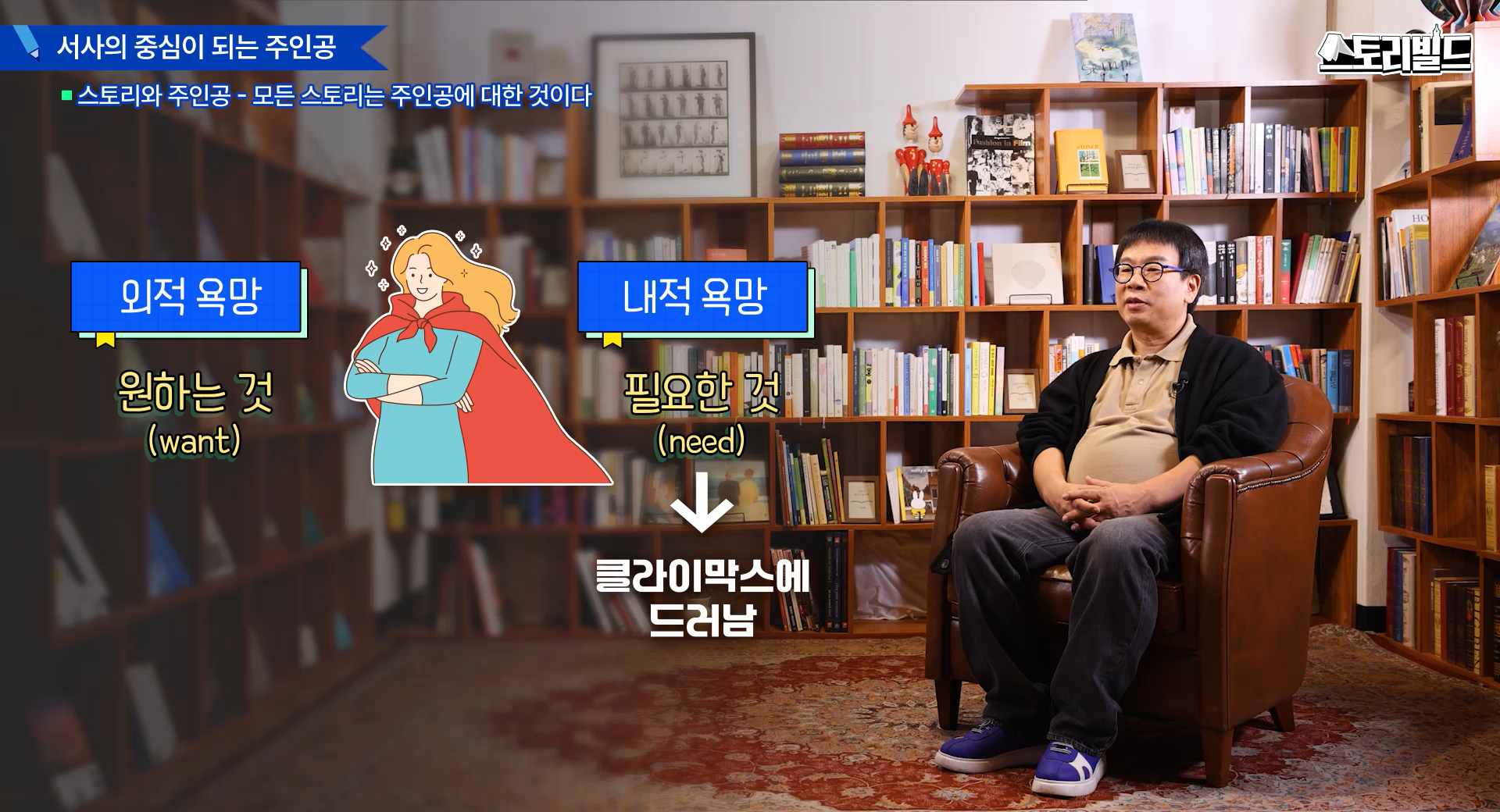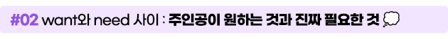 그래서 주인공의 욕망은 보통 이렇게 나눠볼 수 있어요. 원하는 것(want)와 필요한 것(need) 입니다. 🔥 원하는 것은 주인공이 지금 당장 얻고 싶어 하는 목표이고, 필요한 것은 그 여정을 지나서야 비로소 깨닫게 되는 가치예요.